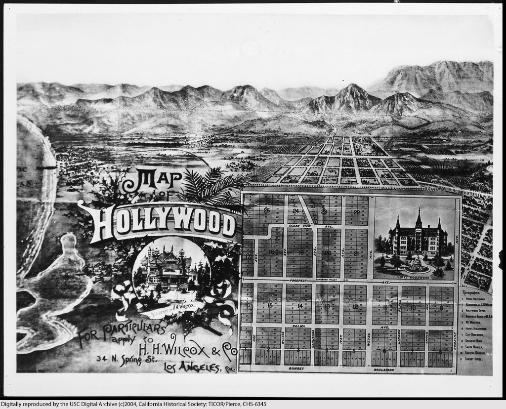 Many people continue to circulate this map as a recorded deed. It is actually an advertisment from a bank that was published many years after the event. If you look at street names, location of the Hollywood Hotel and many other facts you can see it is incorrect historically. If you have the time go to the Los Angeles County Recorder’s Office. It has the actural February 1, 1886 deed from H. H. Wilcox. The name Hollywood is not on the deed. Even though this picture is at the California Historical Society it does not mean it is a deed. I hope this will clear up some historical facts about Hollywood. That is why the best source comes from the person who actually is the Father of Hollywood, HJ Whitley.